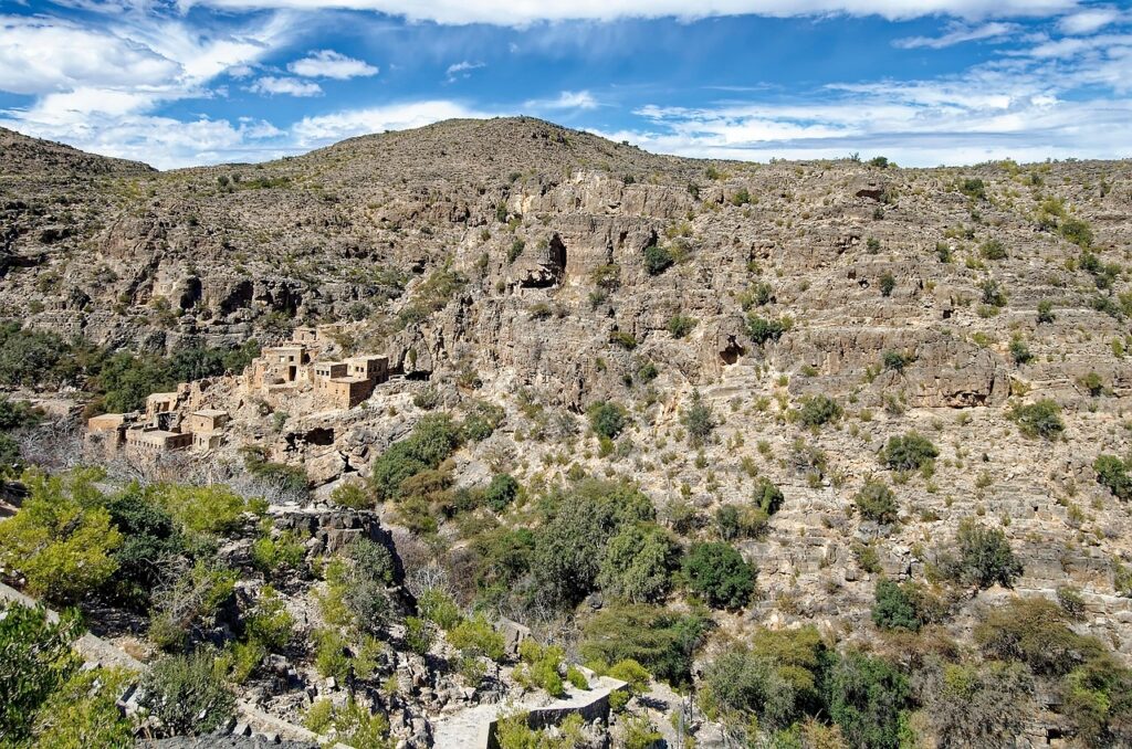 Na het bezoek aan de wadi vertrekken we richting Jebel Akhdar, ook wel “de groene parel van Oman” genoemd. Gelegen op 2000 meter boven zeeniveau in de Al Hajar-gebergten, biedt Jebel Akhdar een koel klimaat en spectaculaire uitzichten. De regio staat bekend om zijn terrasvormige boomgaarden met fruitbomen, gevoed door natuurlijke bronnen en traditionele aflaj (irrigatiesystemen). We krijgen de tijd om te wandelen door de pittoreske dorpjes en de terrasplantages, die een panoramisch uitzicht bieden op het dramatische landschap van pieken, kloven en wadi’s.