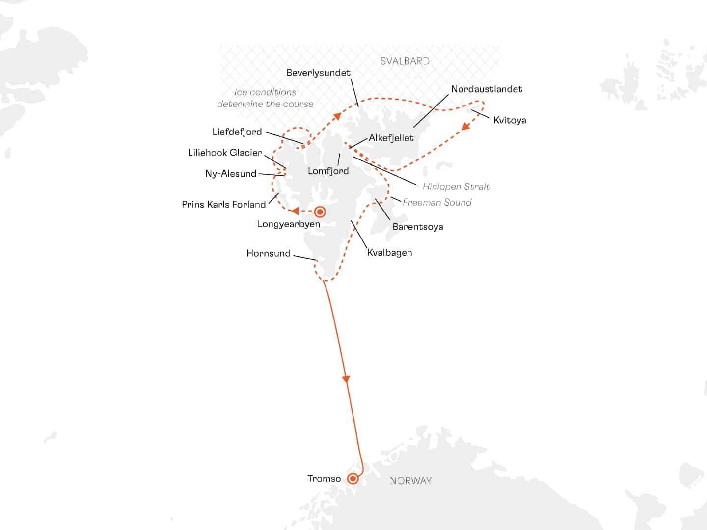 In Ny-Ålesund, waar Amundsen en Nobile in 1926 de Noordpool bereikten, ontmoet u geschiedenis en natuur. Liefdefjorden biedt spectaculaire vergezichten met de glinsterende Monacobreen-gletsjer. Pakijs bepaalt de route en bepaalt of een volledige omvaart mogelijk is. Walrussen rusten op de rotsen van Torellneset, terwijl Freeman Sound en de majestueuze Samarinbreen-gletsjer in Hornsund uw expeditie onvergetelijk maken.