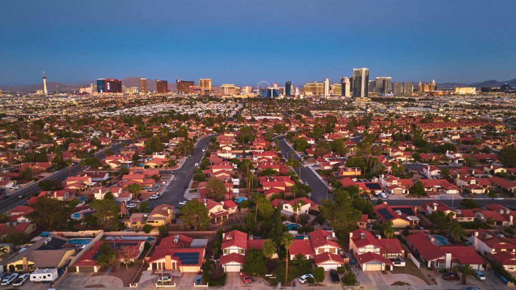 Aankomst in Las Vegas in de vroege avond, de stad die nooit slaapt.